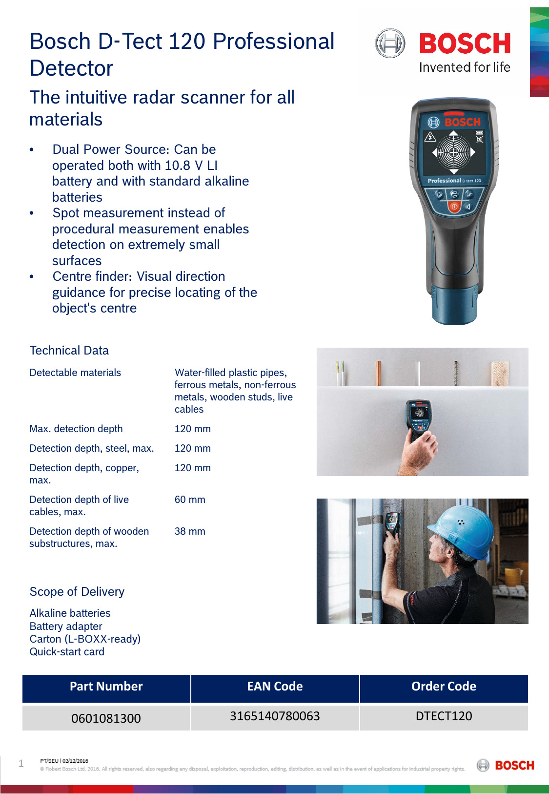 El DTECT120 de Bosch es un detector compacto capaz de detectar diversos materiales, incluidos tubos de plástico llenos de agua, metales ferrosos, metales no ferrosos, postes de madera y cables con corriente. Perfecto para encontrar o evitar objetos al taladrar.