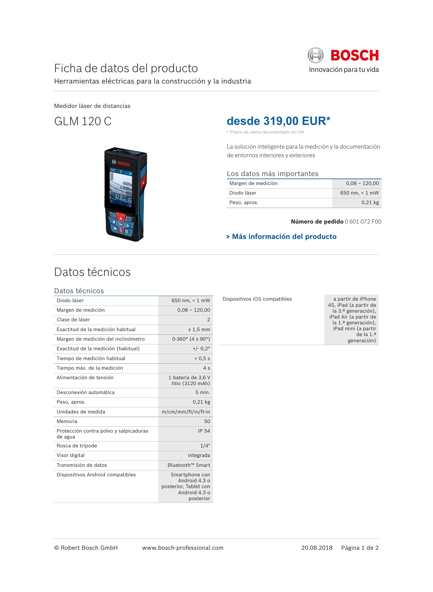 Diodo láser: 650 nm, <1 mW Rango de medida: 0.08 - 120.00 Clase de laser: 2 Precisión de la medida, típica: ± 1.5 mm Rango de medición de la medición de inclinación: 0 - 360 ° (4 x 90 °) Precisión de medida (típica): +/- 0.2 ° Tiempo de medición, típico: <0.5 s Tiempo de medición, máximo: 4 s. Fuente de alimentación: 1 x 3,6 V batería de ion litio (3120 mAh) Desactivación automática: 5 min. Unidades de medida: m / cm / mm / ft / inch / ft-inch Capacidad de memoria (valores): 50 Protección contra polvo y salpicaduras: IP 54 Visor digital: integrado. Transferencia de datos: Bluetooth ™ Smart Dispositivos Android compatibles: Smartphone con Android 4.3 o superior, Tableta con Android 4.3 o superior Dispositivos iOS compatibles: iPhone 4S o superior, iPad (3ª generación o superior), iPad Air (1ª generación o superior), iPad mini (1ª generación o superior)