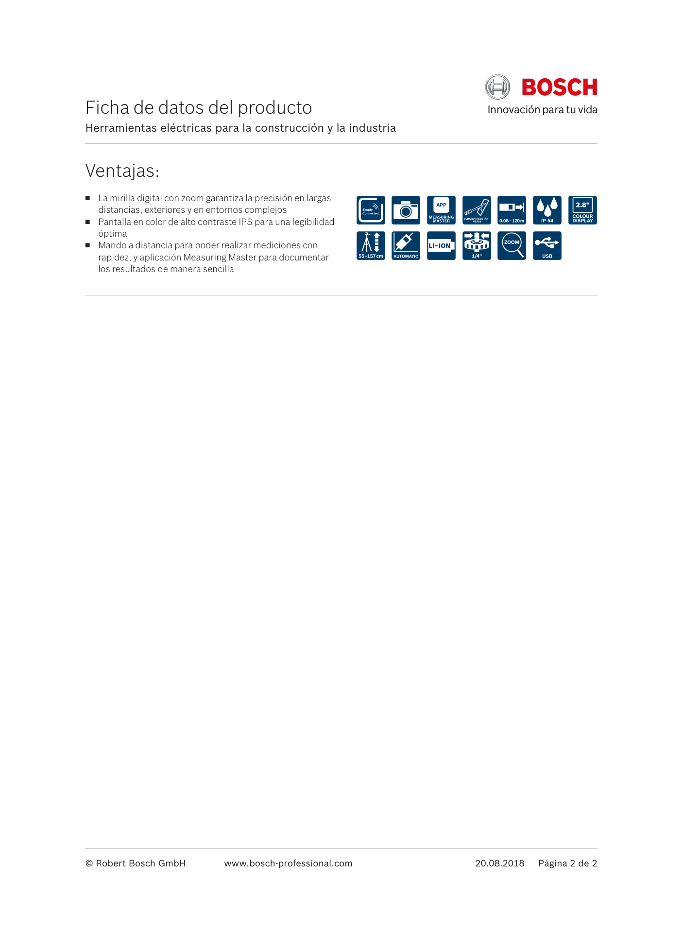 La medición láser Bosch GLM 120 C es la solución inteligente para medir y documentar entornos tanto en interiores como en exteriores. Cuenta con un visor digital con una función de zoom para garantizar la precisión en grandes distancias y en entornos complejos. La pantalla a color IPS de alto contraste proporciona una legibilidad óptima y la pantalla de vidrio resistente a los arañazos proporciona lecturas precisas y durabilidad. Es un control remoto operado para mediciones rápidas y es compatible con Bosch Simply Connected, la aplicación para teléfono inteligente conectada a Bluetooth que permite la documentación de resultados simples sin la necesidad de tocar, o potencialmente mover el láser.