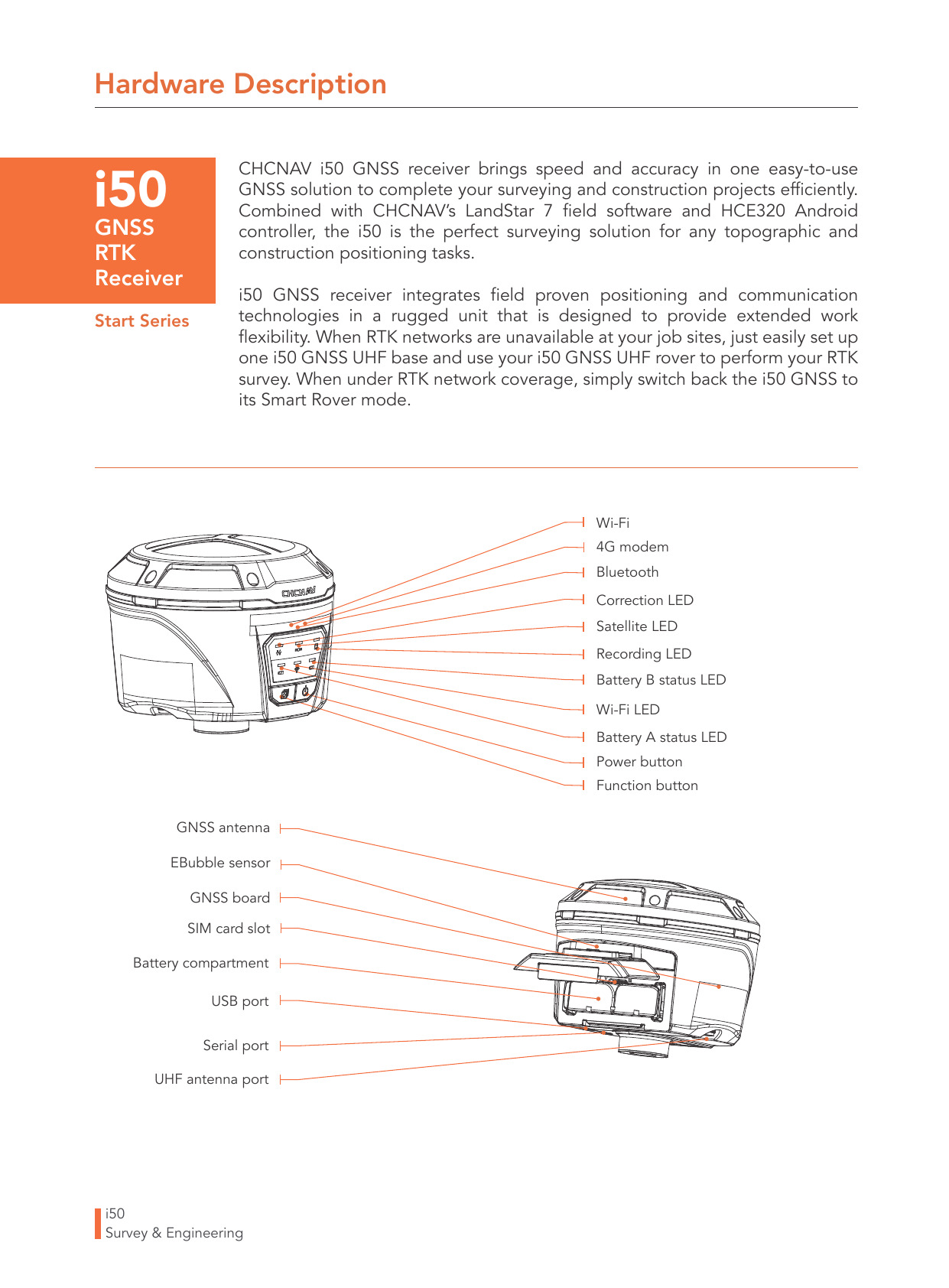 El receptor CHCNAV i50 GNSS brinda velocidad y precisión en una solución GNSS fácil de usar para completar sus proyectos de topografía y construcción de manera eficiente.