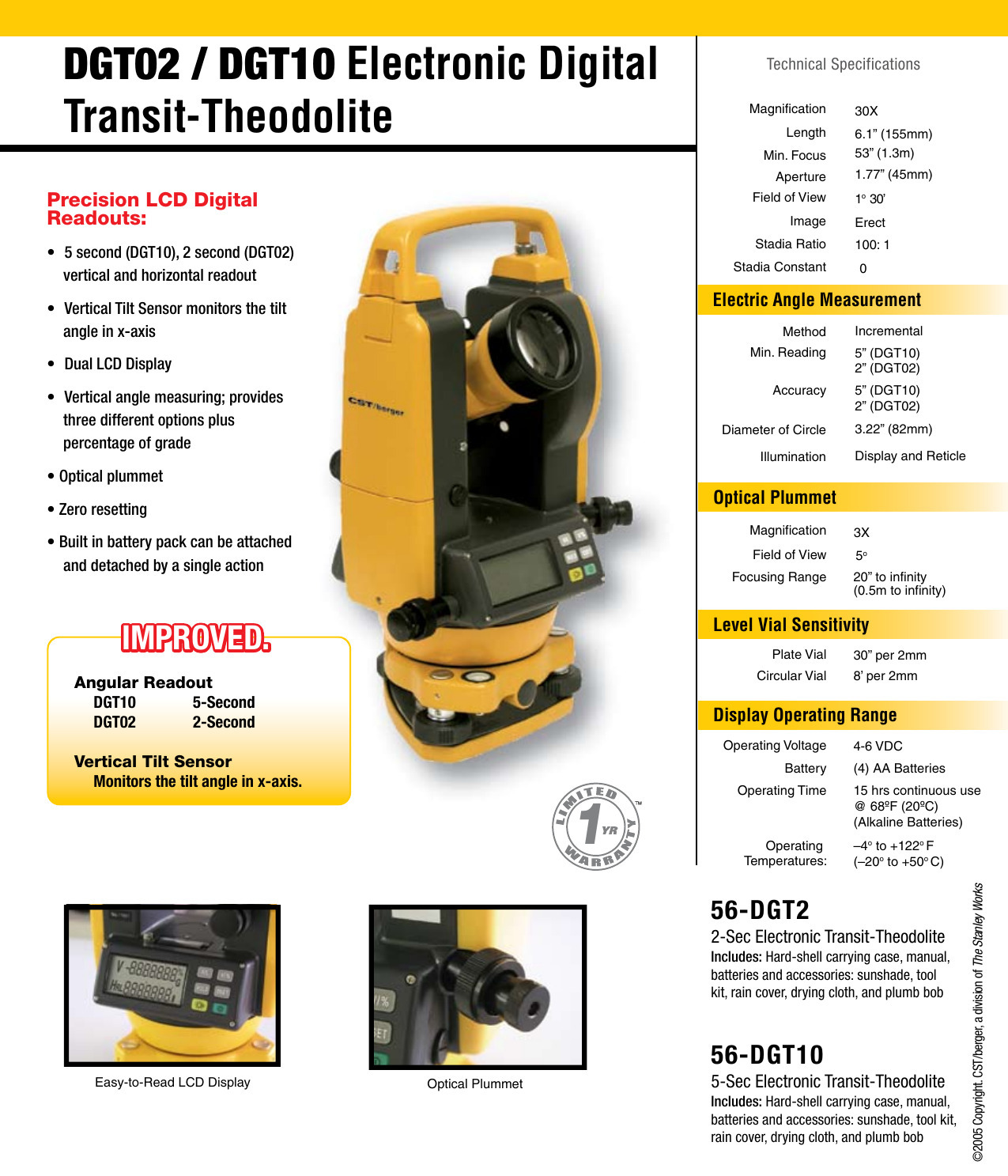 Los teodolitos CST incorporan un amplio visor por los dos lados para conseguir los mejores resultados topográficos. La elección más acertada si desea conseguir la máxima precisión de medición en trabajos de construcción, gracias a que estas herramientas topográficas están diseñadas para medir ángulos verticales y horizontales con total efectividad.
