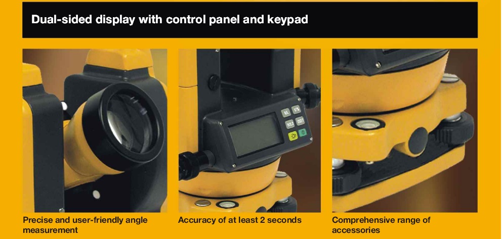 El Teodolito Electrónico cts-berger-logo DGT-10 de lectura dual, horizontal y vertical. Visualización de pantalla y cursor del telescopio para bajas condiciones de iluminación. Medición vertical angular en grados y porcentajes. Resistente al agua. Apagado automático con tres opciones: cero, 20 min., o 30 minutos. Plomada óptica. Ajuste a cero, visualización del sentido horario y anti-horario.