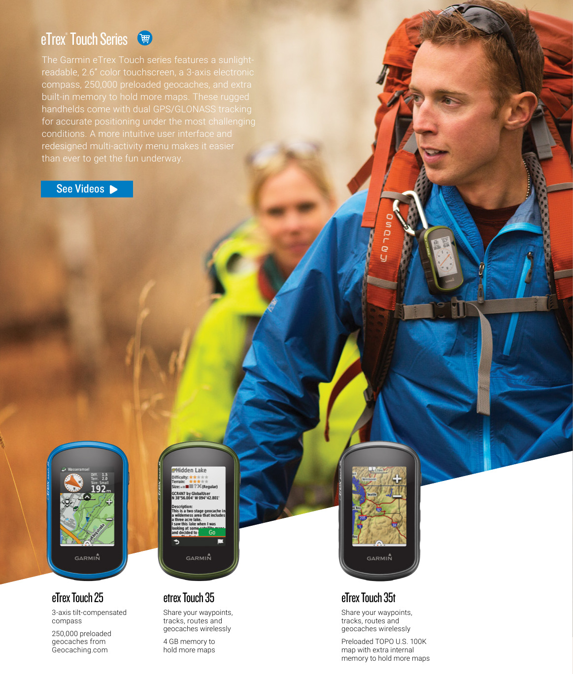 eTrex Touch 35 es la nueva incorporación de la gama de navegadores para actividades al aire libre y aventuras alpinas, ideal para todo aquel que le guste zambullirse en los mejores espacios al aire libre, desde ciclistas ocasionales y excursionistas, a novatos del geocaching y senderistas.