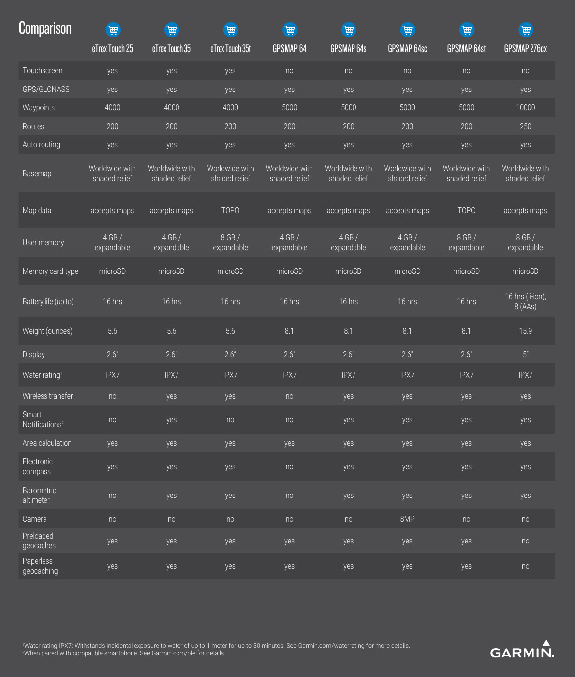 eTrex Touch es compatible con GPS y GLONASS, lo que te proporciona la potencia de dos sistemas por satélite, para una posición más rápida y una mejor precisión en entornos difíciles. eTrex 35 también incluye un altímetro barométrico a la mezcla, para una navegación más segura en entornos alpinos y datos de altura precisos. El dispositivo tiene resistencia al agua IPX7 y cuenta con una pantalla resistente a arañazos. Las 16 largas horas de autonomía y las pilas AA estándar sustituibles in situ te garantizan flexibilidad al desplazarte. eTrex Touch también proporciona todas las funciones clásicas de eTrex.