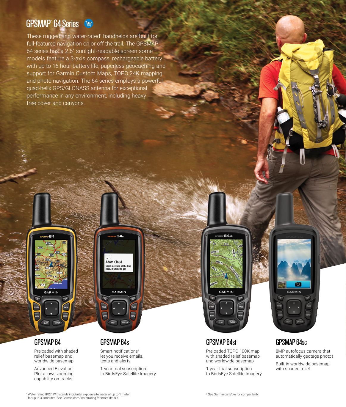 El nuevo GPSMAP® 64s posee una pantalla de 2,6″ que puede leerse a la luz del sol y un receptor GPS y GLONASS de alta sensibilidad con una antena Quadrifilar Helix para una capacidad de recepción de calidad superior. El compacto y resistente al agua el GPSMAP 64s incluye un altímetro barométrico y una brújula de tres ejes. Se conecta de forma inalámbrica a tu smartphone para permitir el rastreo en tiempo real y el uso de la función de notificación inteligente.