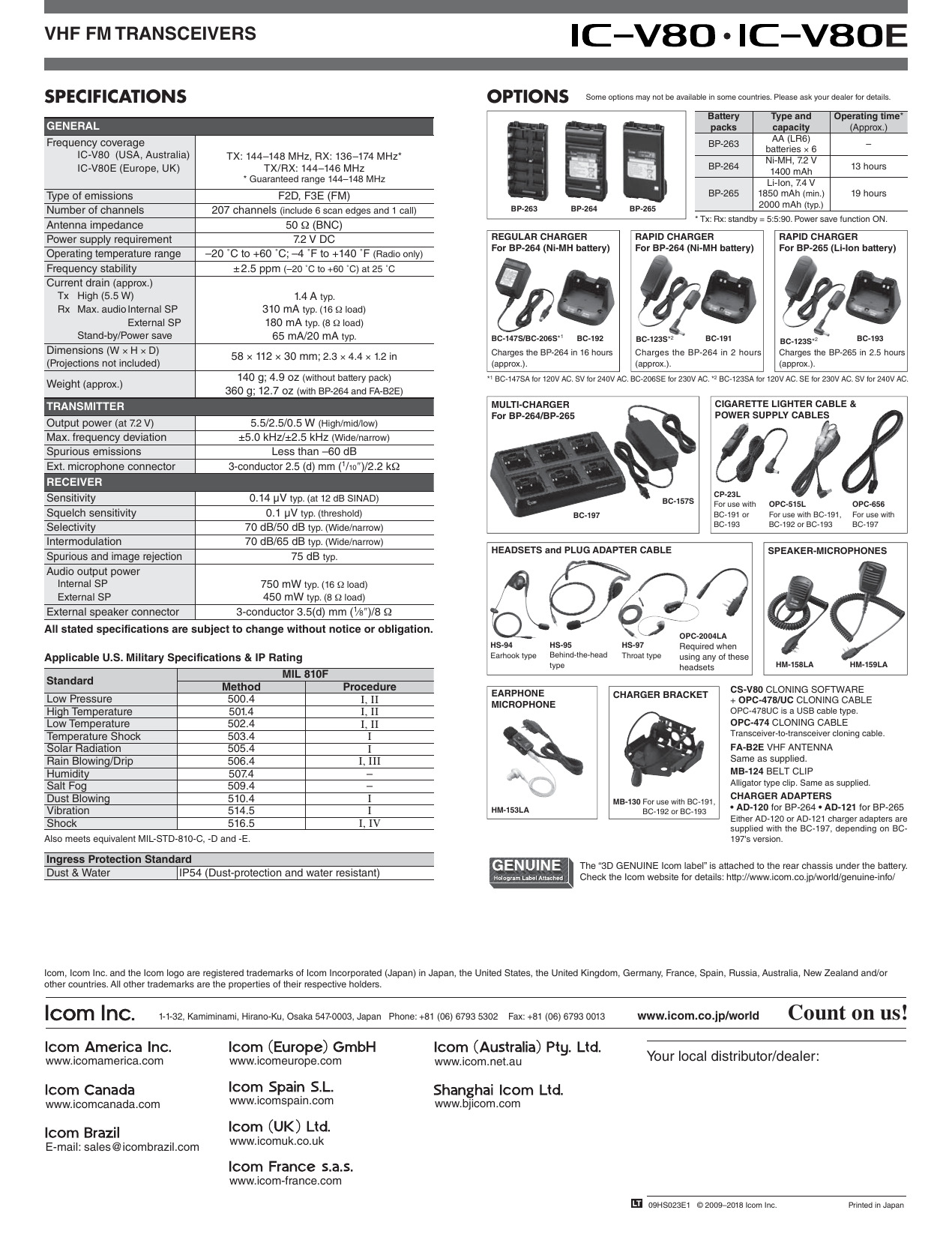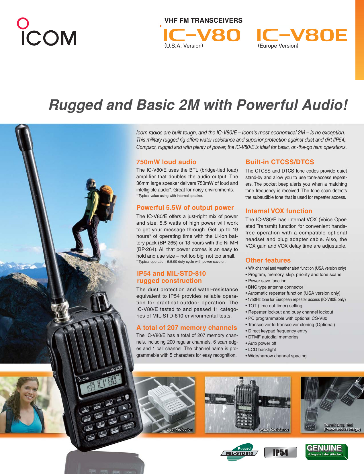La protección contra el polvo y la resistencia al agua equivalente a IP54 proporcionan un funcionamiento confiable para un funcionamiento práctico en exteriores. El IC-V80 / E probó y aprobó 11 categorías de pruebas ambientales MIL-STD-810.