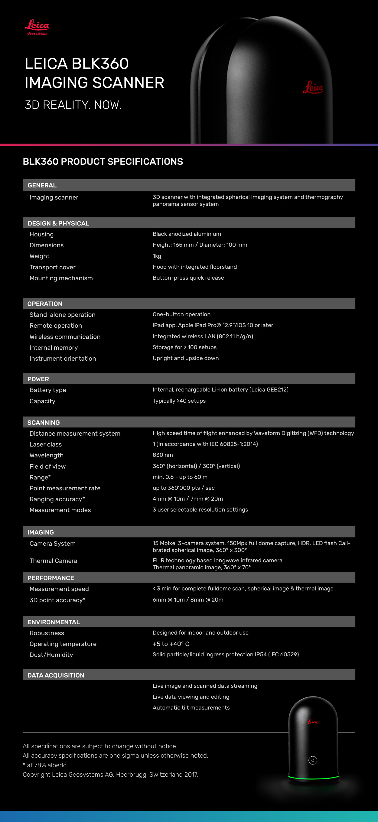 El Leica BLK360 captura el mundo a su alrededor con imágenes panorámicas a todo color superpuestas en una nube de puntos de alta precisión. El escáner BLK360 es el más pequeño y ligero de su clase, y se puede usar con facilidad con solo pulsar un botón. Cualquier persona capaz de manejar un iPad puede capturar el mundo a su alrededor con imágenes panorámicas 3D de alta resolución.