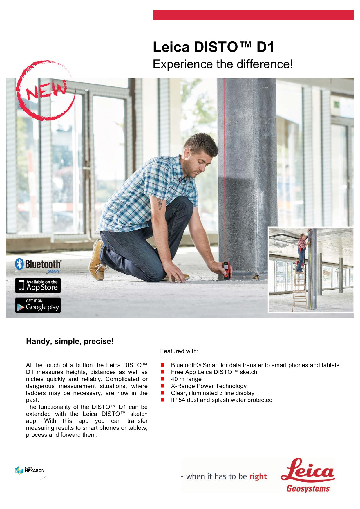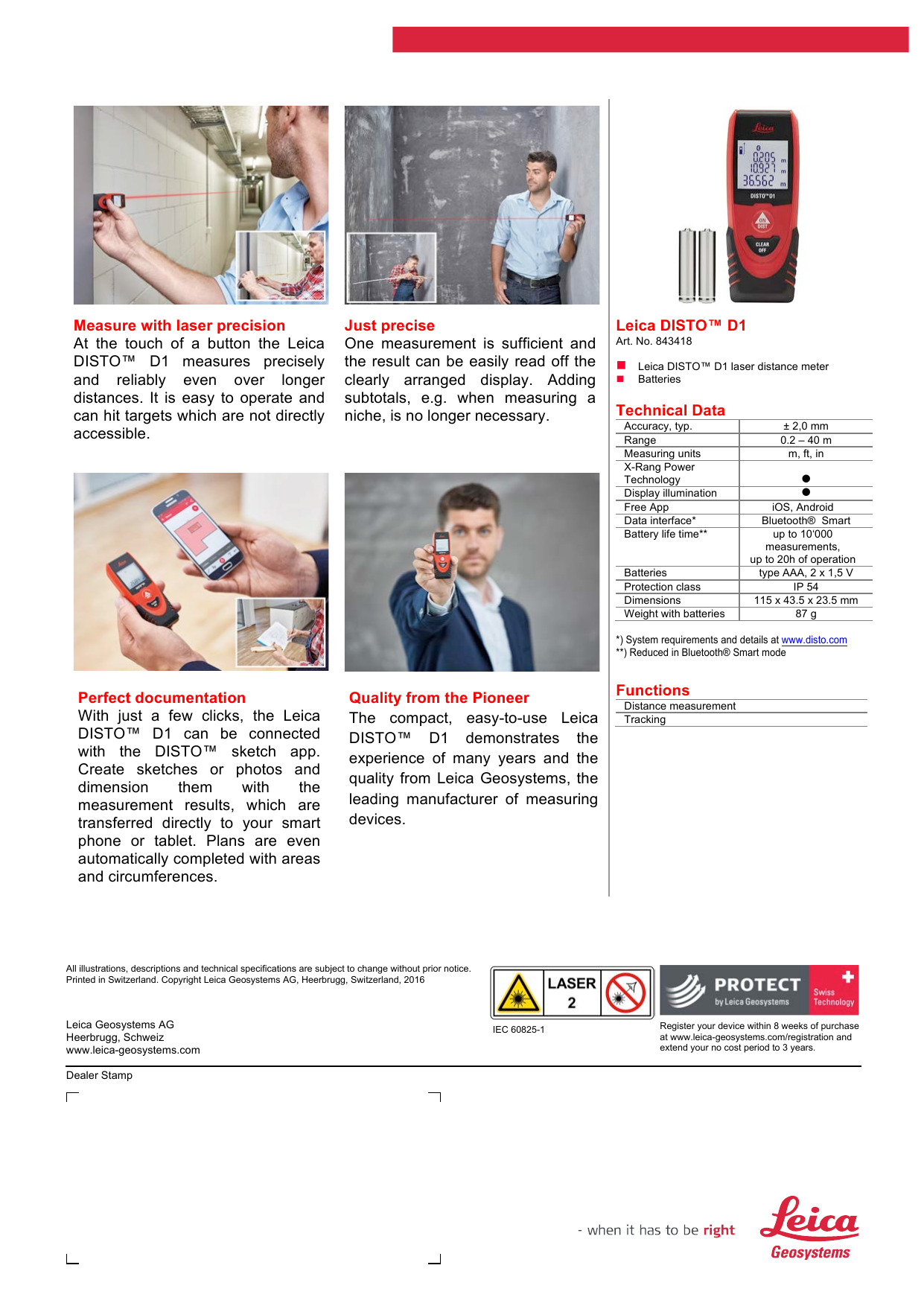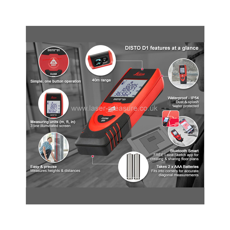 Gracias a la tecnología láser precisa, el modelo básico Leica DISTO™ D1 proporciona siempre resultados de medición fiables. Además su manejo es muy fácil e intuitivo. Confíe en el original.