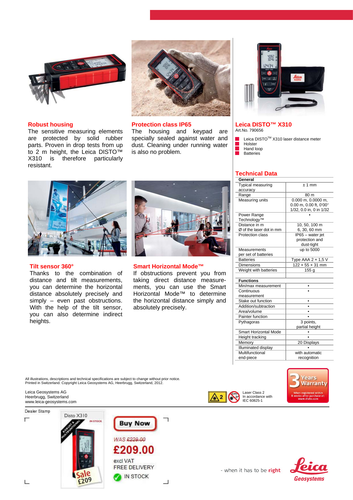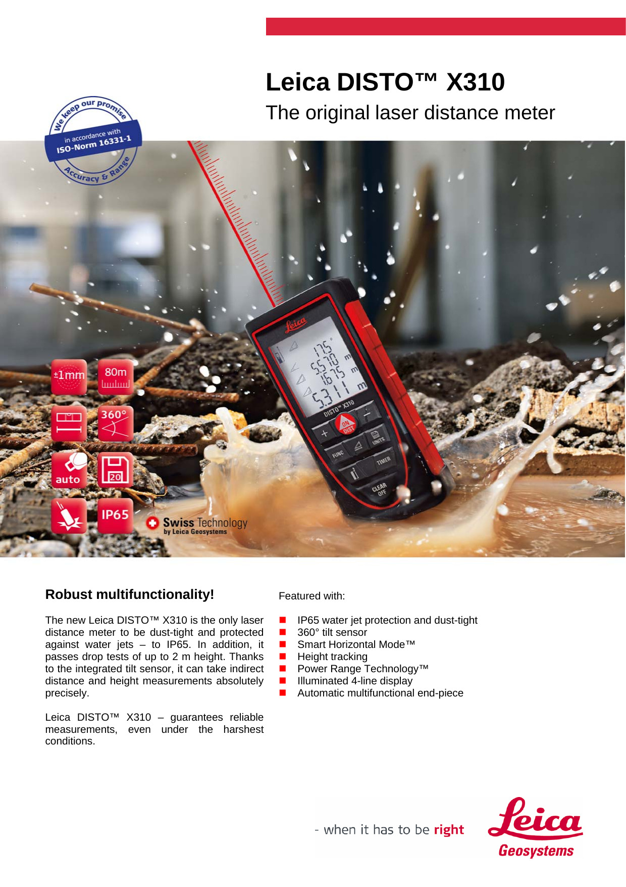 El nuevo Leica DISTO™ X310 es el único distanciómetro láser con protección IP 65 contra polvo y chorros de agua, además de soportar caídas desde 2 m. Gracias al sensor de inclinación integrado, puede medir distancias y alturas de forma indirecta con gran precisión.