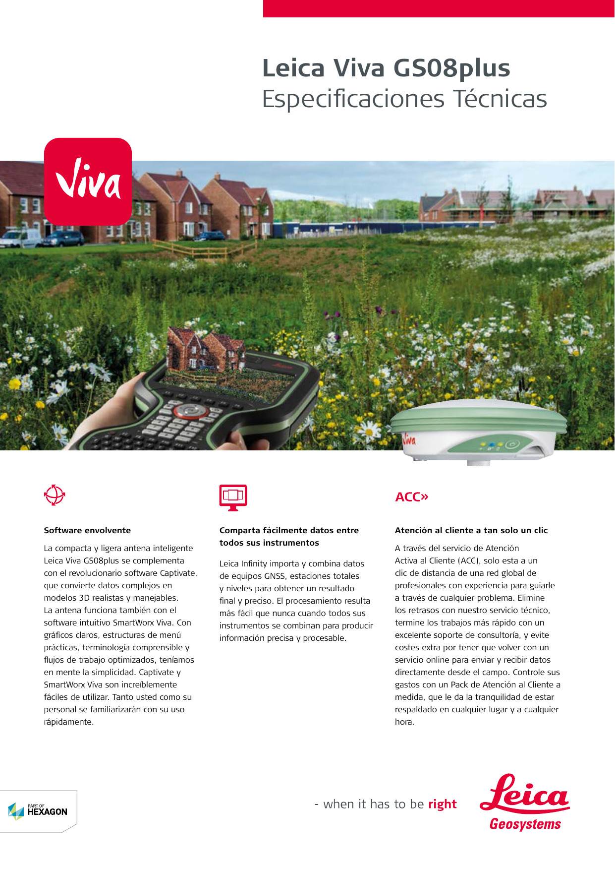 La antena inteligente Viva GS08plus, compacta y ligera, está equipada con el revolucionario Leica Captivate, que convierte datos complejos en modelos 3D realistas y manejables. Esta antena también trabaja con el software intuitivo Leica SmartWorx Viva. Con gráficos claros, estructuras de menús prácticos, terminología comprensible y flujos de trabajo simplificados, ahorre tiempo y esfuerzo en cualquier sitio. SmartWorx Viva es muy fácil de aprender y de utilizar.