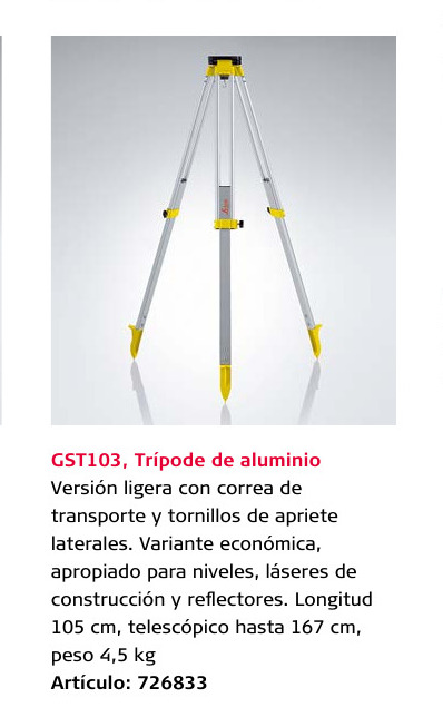 TRIPODE DE ALUMINIO LEICA – > MARCA: LEICA -> MODELO: GST103 ; realizamos entrega en las ciudades de Lima, Arequipa, Cusco , Moquegua , Tacna , Ica , Chiclayo , Trujillo, Cajamarca, Piura, Tumbes, iquitos, Huancayo , Ayacucho , Pucallpa, Huanuco , Cerro de Pasco ; llevamos mas de 10 años comercializando LEICA en Peru , somos especialistas importando tripode de aluminio leica, tripode profesional , tripode para niveles leica, tripode para estacion total leicaTrípode Aluminio LEICA GST103