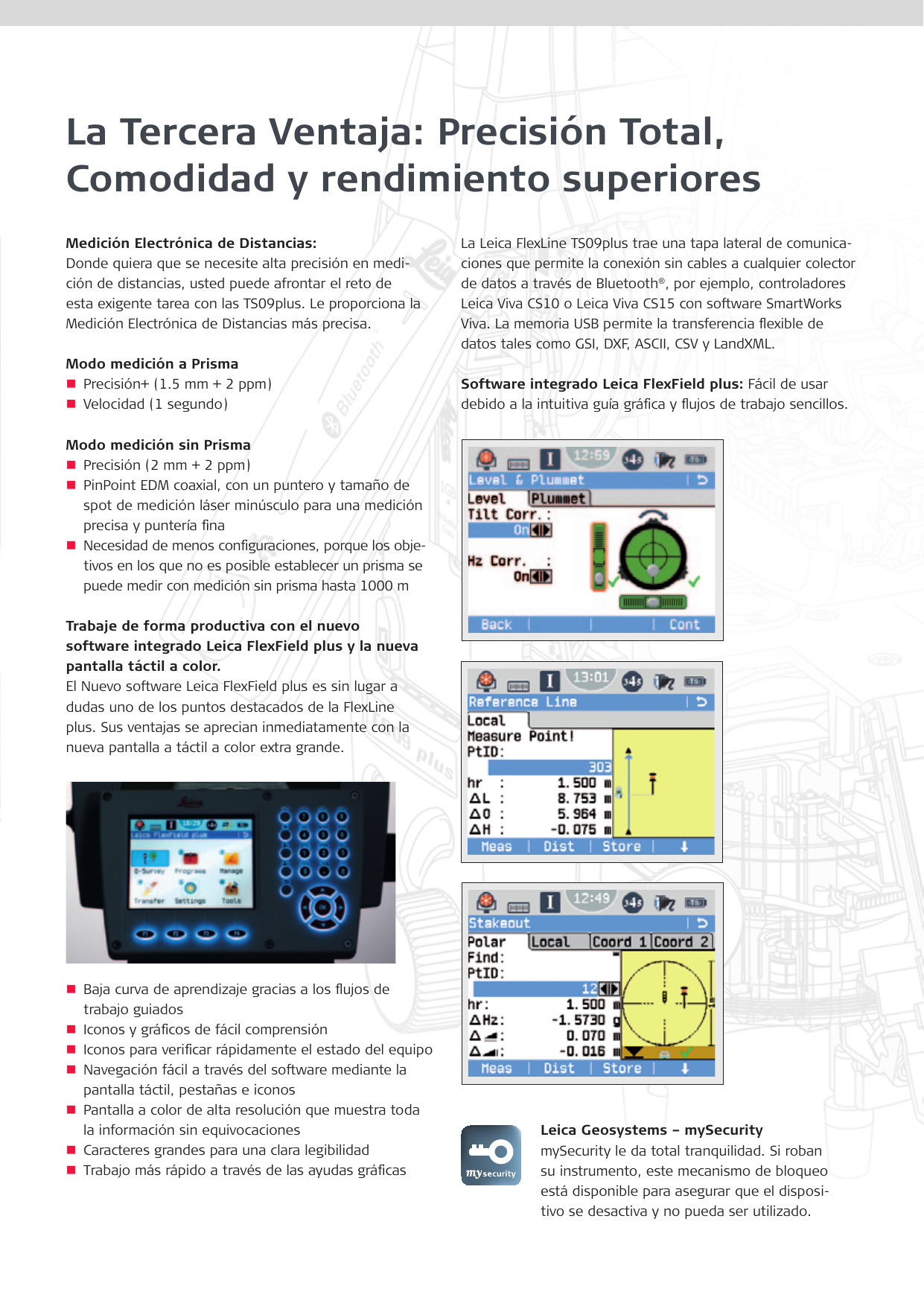 Aplicaciones incluidas: Topografía, Replanteo, Estacionamiento: Inversa, Inversa Local, Inversa Helnert, Orientación (Angulo & Coordenadas), Transferencia de Cota, Area (Plano & Fachada), MDT Calculo de Volumen, Distancia entre puntos (MLM), Altura Remota, Puntos ocultos, Comprobación de Orientación, Offset, Línea de Referencia, Arco de Referencia, Plano de Referencia, COGO, Carreteras 2D, Carreteras 3D, Poligonal PROTECCION ANTIRROBO mySecurity, Código PIN/PUK
