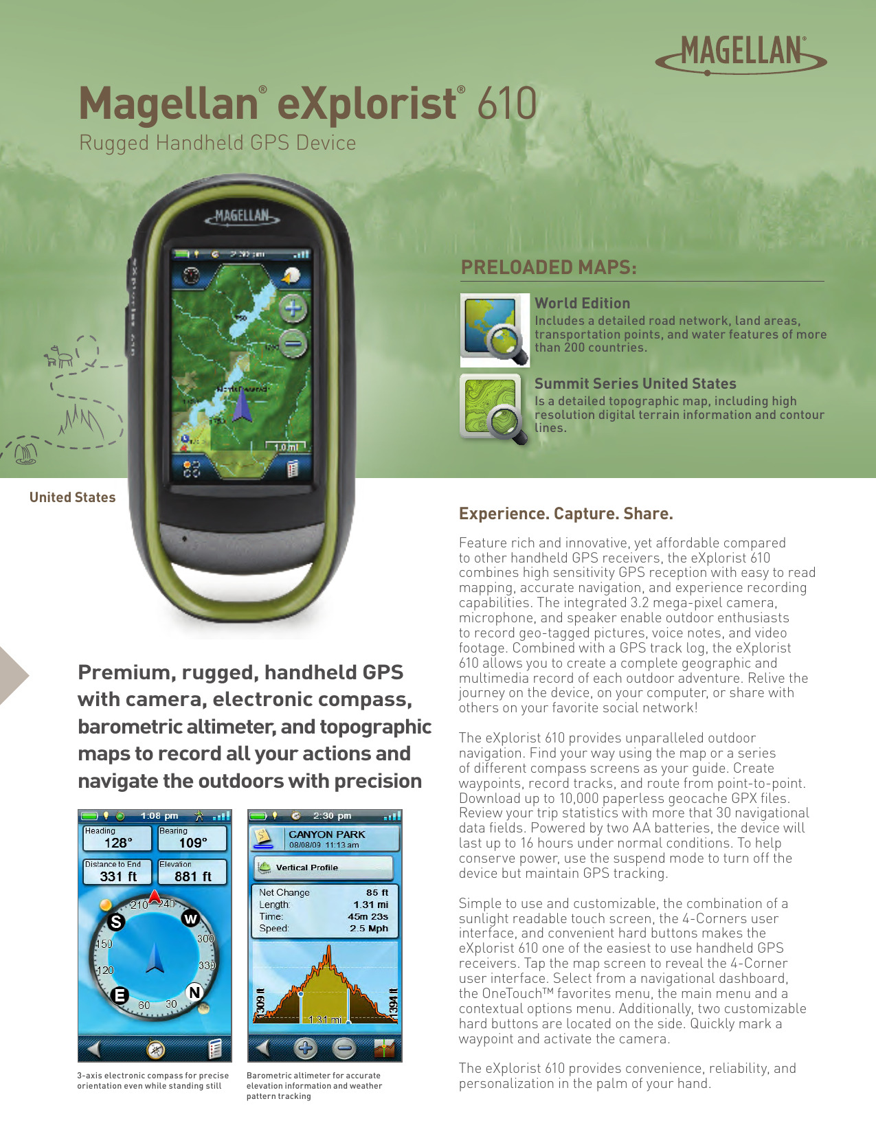 Robusto e impermeable (IPX-7), el eXplorist 610 combina una recepción GPS de alta sensibilidad con un mapeo fácil de leer y una navegación precisa. Encuentra tu camino usando más de 30 campos de datos de navegación. Cree waypoints, grabe pistas y dirija de un punto a otro. La cámara, el micrófono y el altavoz de 3,2 megapíxeles integrados permiten a los entusiastas del aire libre grabar imágenes georreferenciadas y notas de voz. Reviva sus aventuras al aire libre en el dispositivo, en su computadora o compártalas con otras personas en varias comunidades en línea como geocaching.com.