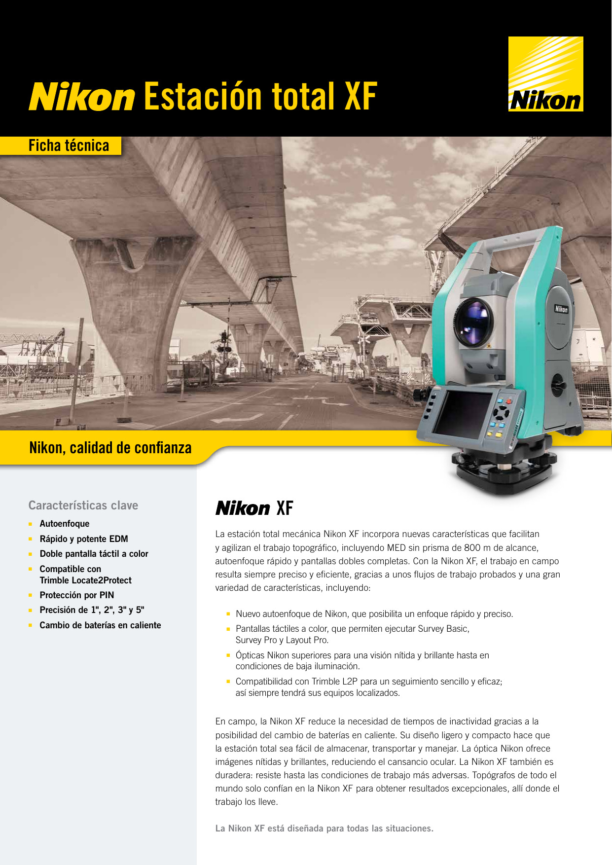 Producida en Japón por el grupo NIKON/TRIMBLE, se trata de la última generación de estaciones totales, de tamaño compacto y liviano, aptas para medición con y sin prismas. Equipadas con la ya legendaria óptica Nikon de elevada claridad, brindan imágenes nítidas en toda condición de luz, haciendo fáciles las mediciones y reduciendo la fatiga ocular.