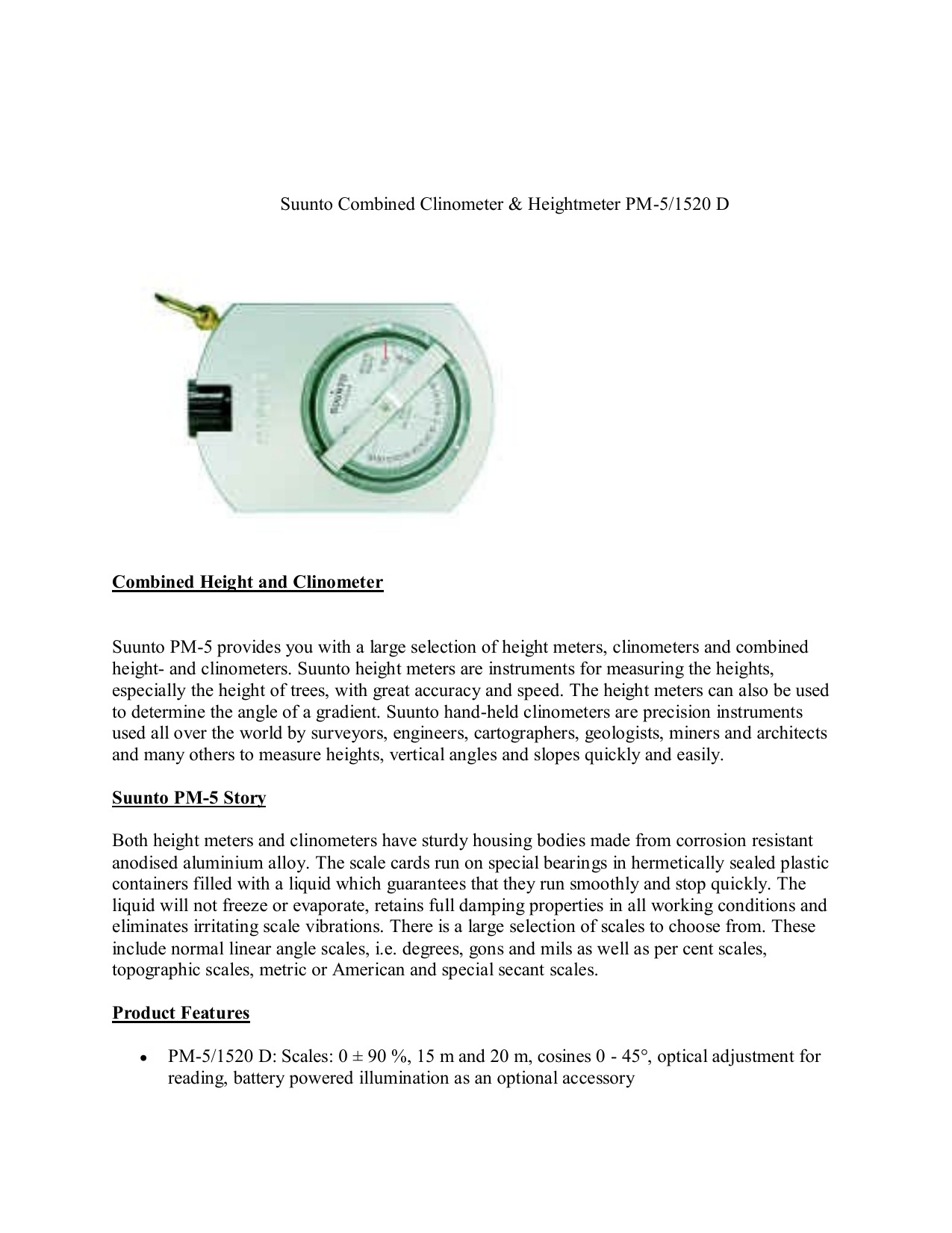 El medidor de altura Suunto PM-5/1520 es un instrumento para medir alturas, especialmente las alturas de árboles, con gran precisión y velocidad. También se puede utilizar para determinar el ángulo de un gradiente. El cuerpo del instrumento es de aleación de aluminio anodizado resistente a la corrosión. La tarjeta de escala se ejecuta en un cojinete especial en un recipiente de plástico herméticamente cerrado lleno de un líquido que garantiza que se ejecute libremente y se detenga rápidamente. El líquido no se congelará, conservará todas las propiedades de amortiguación en las condiciones de trabajo y eliminará las vibraciones irritantes de la escala.