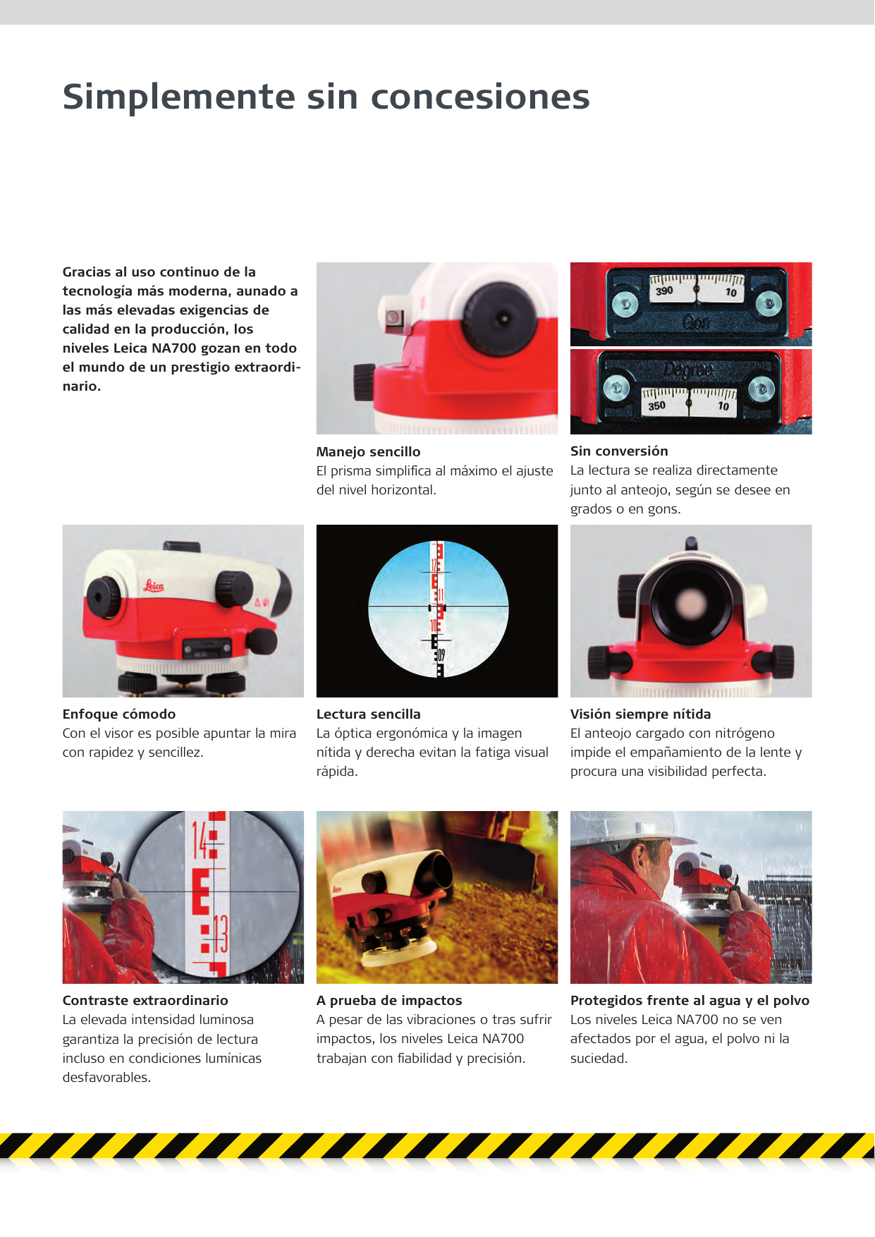 Los peligros en el sitio, que incluyen pequeñas caídas al suelo, la exposición al agua y las grandes vibraciones de maquinaria pesada, no son un problema para la resistente Leica NA728. Sin necesidad de reajustes, este nivel puede continuar funcionando y medir con precisión día tras día.