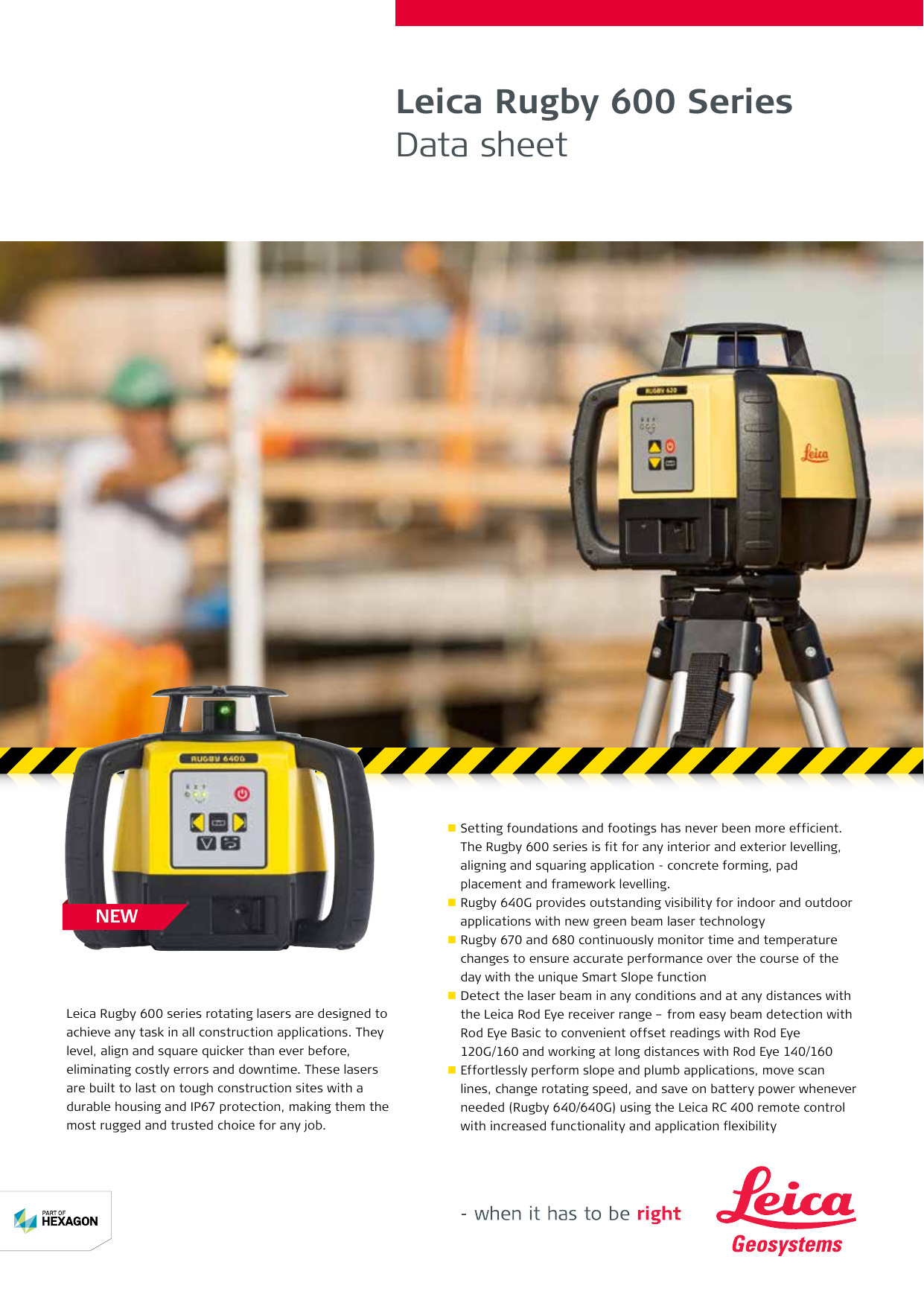 El láser giratorio Rugby 620 brinda resistencia y confiabilidad a un lugar de trabajo con su protección contra agua y polvo IP 67. Además, está cubierto por la oferta de servicios PROTECT by Leica Geosystems, que incluye la garantía de por vida del fabricante y un período sin costo de tres años, que cubre la reparación o el reemplazo de todas las piezas defectuosas, incluido el tiempo de mano de obra, el ajuste y la calibración. El láser rotativo Rugby 620 se entrega en un paquete con una batería de ión de litio de larga duración.