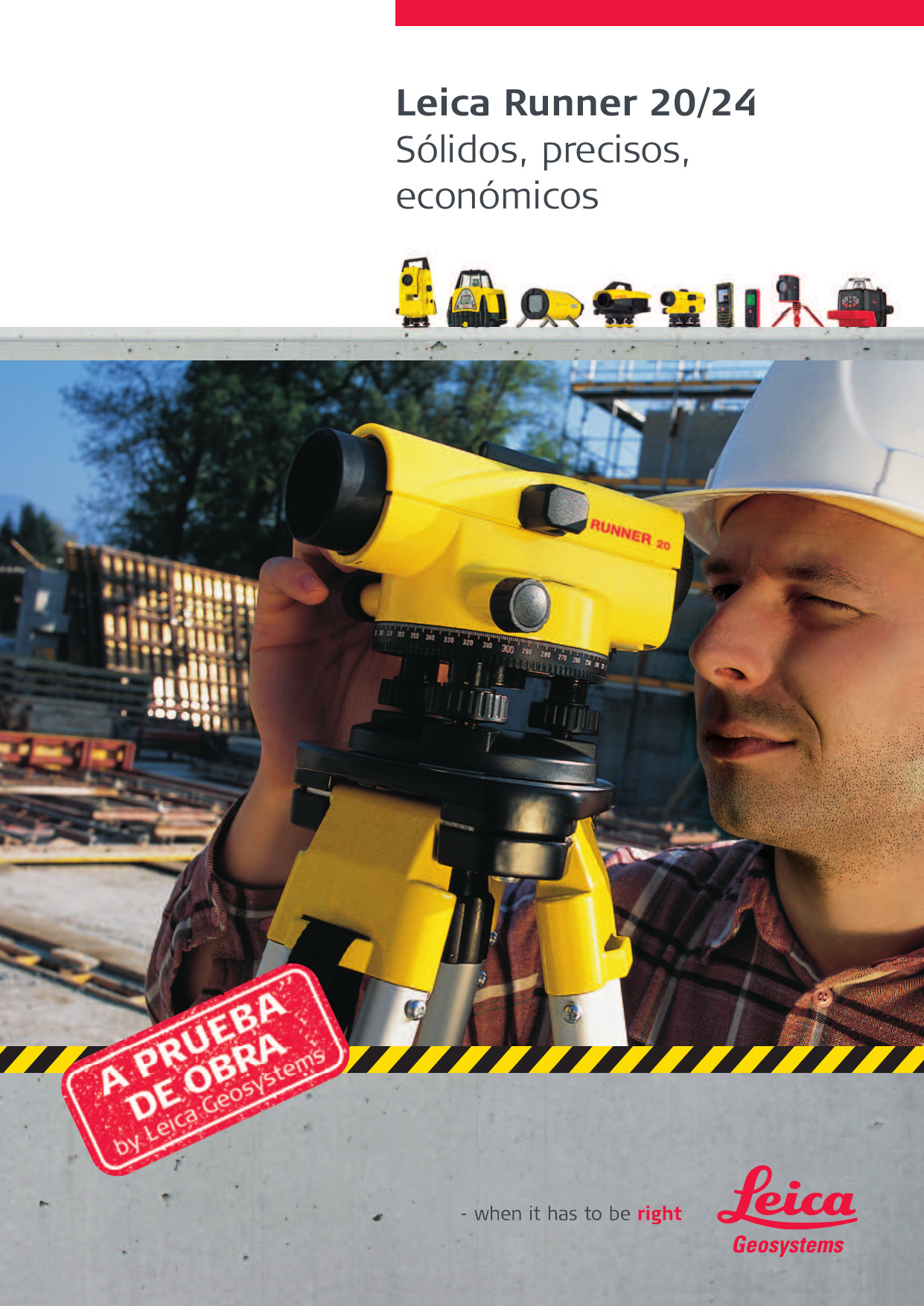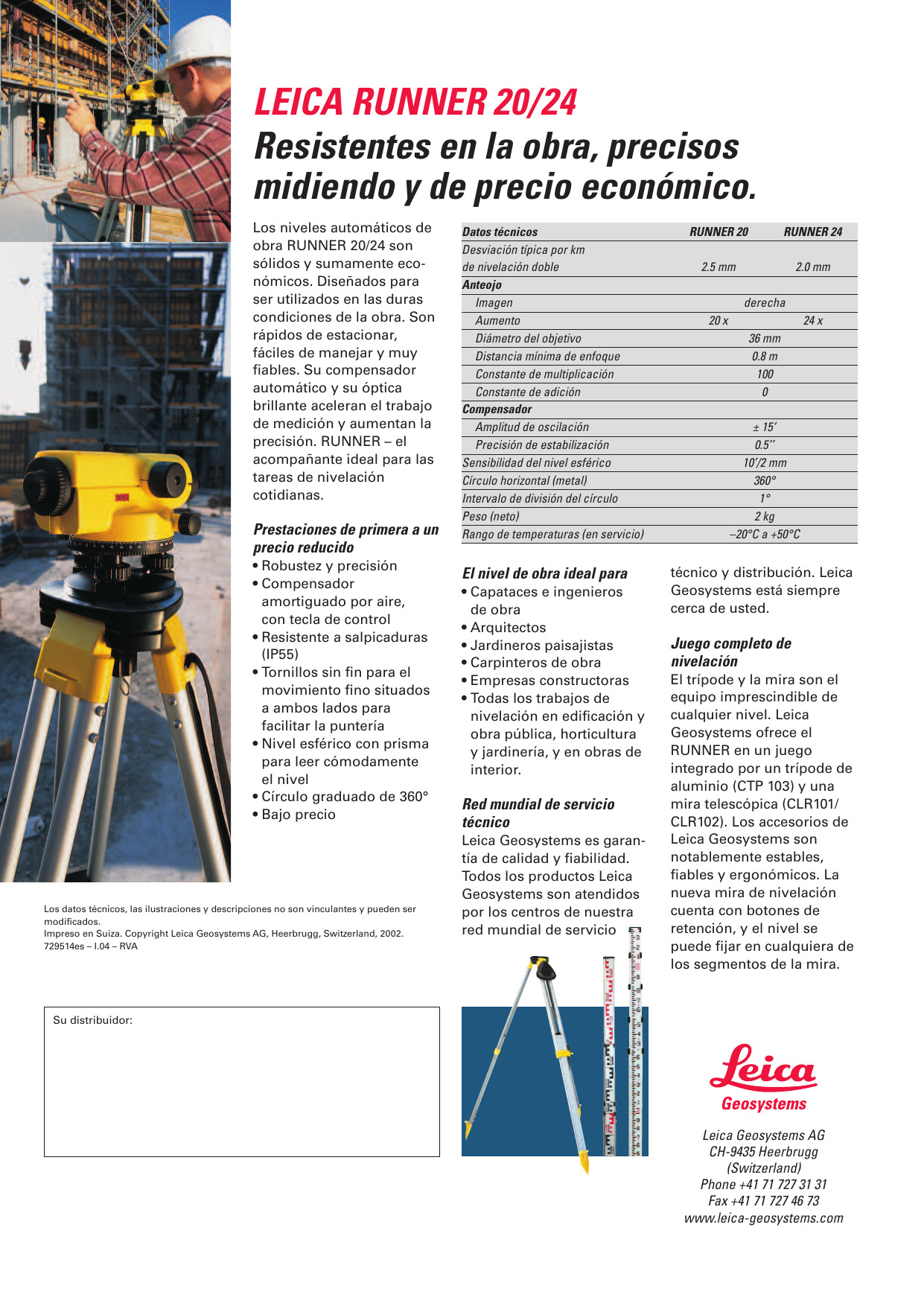 El Nivel leica-logo Runner 24x es un nivel automático de construcción robusto y económico. Diseñado para trabajar duro en la obra. Es rápido de ajustar, simple de usar y muy fiable. El compensador automático y la óptica rápida aceleran las mediciones en la obra y aumentan la precisión. Runner – el compañero ideal para sus tareas de nivelación diarias. Nuestros niveles son imbatibles. Con un nivel de Leica usted puede seguir trabajando.