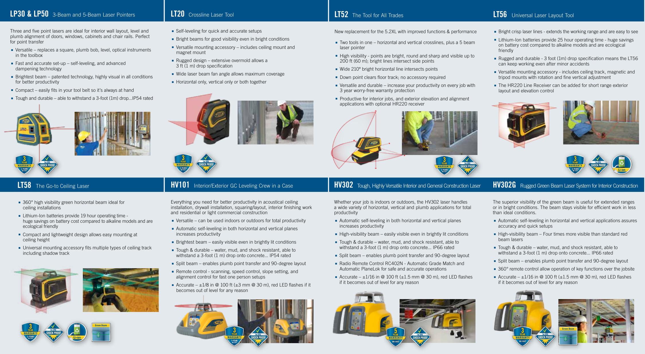 El LT20 Cross Line Laser ha sido diseñado con una nueva apariencia e incluye una resistente carcasa con generoso sobremolde para soportar los rigores del entorno profesional de la construcción. Esta robusta herramienta pasa pruebas de caída de 3 pies (1 m) y está diseñada para durar más que todos los láseres de línea cruzada competitivos.