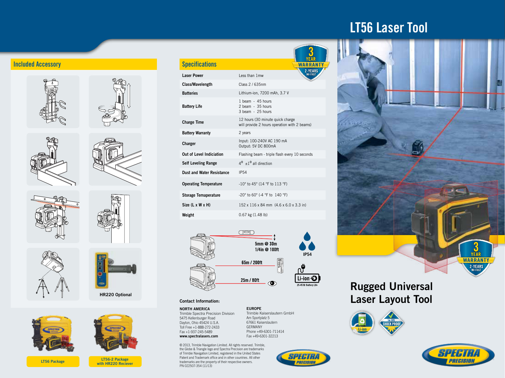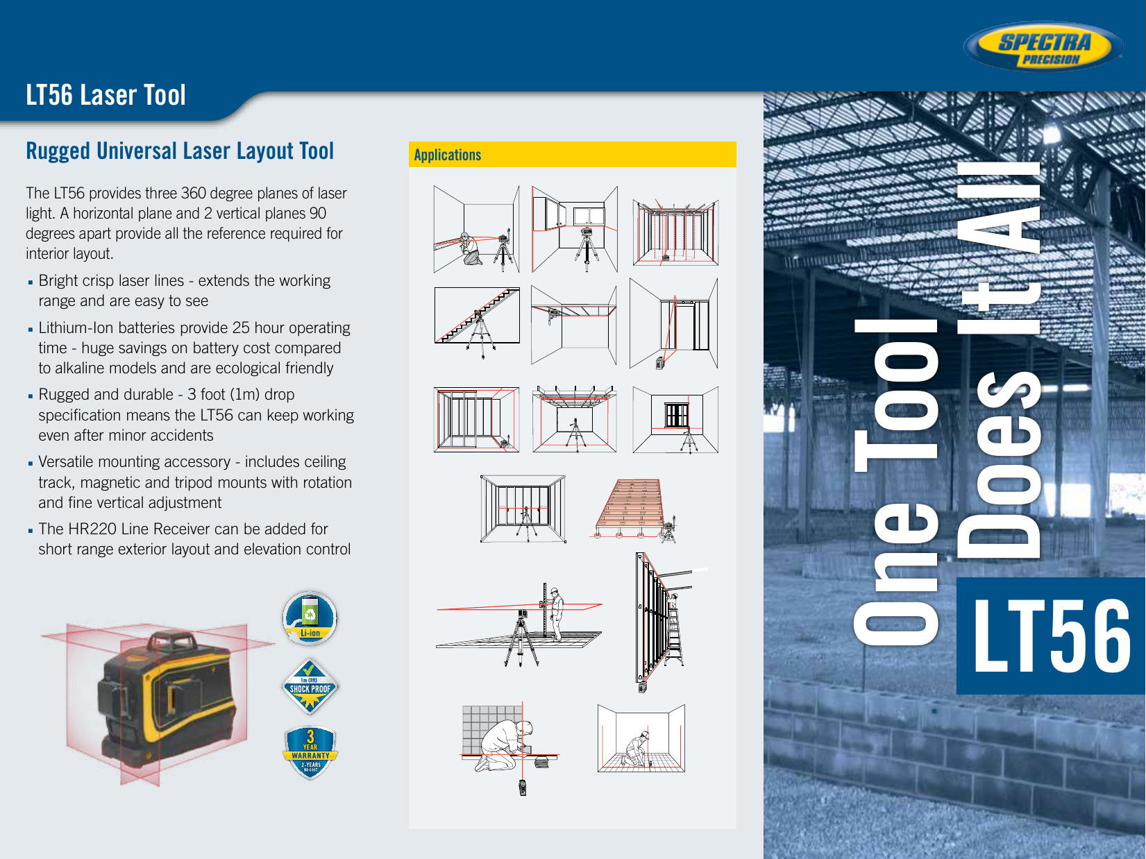 El LT56 se alimenta con baterías recargables de iones de litio que, por lo general, pueden proporcionar una vida útil de la batería de 25 a 45 horas, según la cantidad de aviones láser utilizados. El accesorio universal permite el montaje en la rejilla del techo, trípodes, columnas y montantes de varios tamaños. El soporte tiene ajustes finos de altura vertical y rotación horizontal para configuraciones rápidas y fáciles. El receptor láser HR220 se puede agregar para darle al LT56 la versatilidad adicional del uso en exteriores.